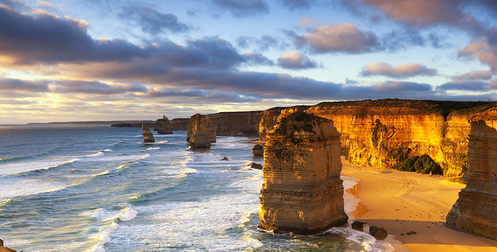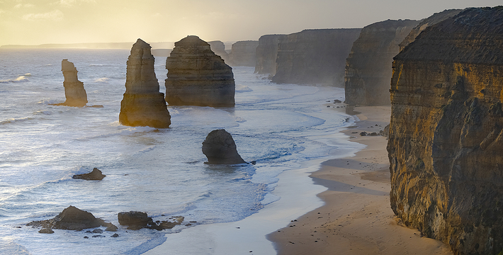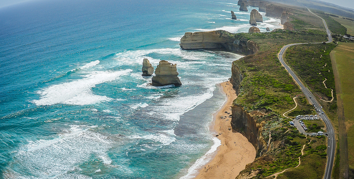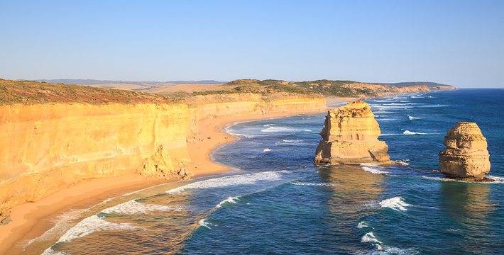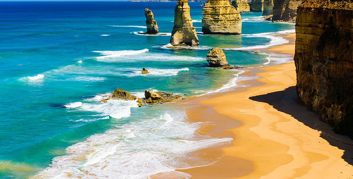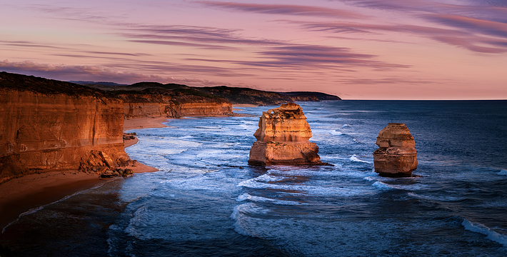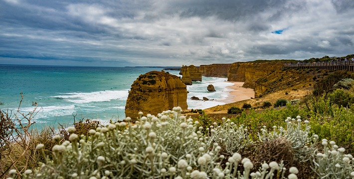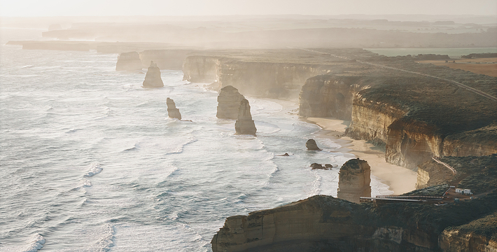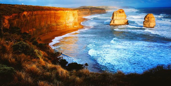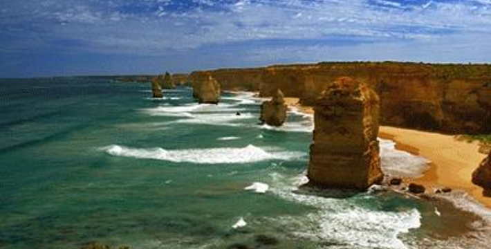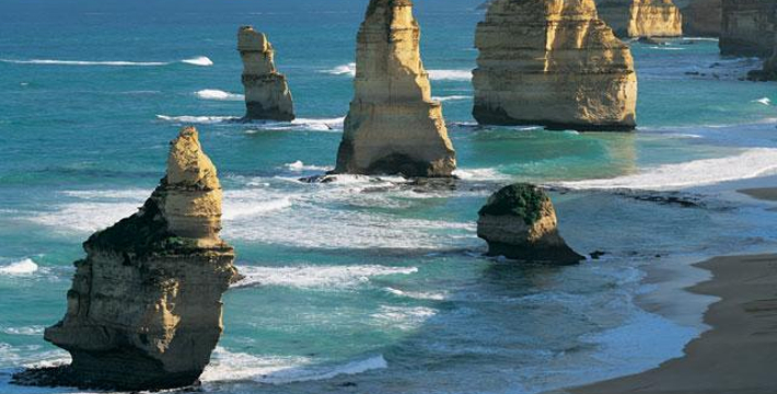 走上大洋路的旅人总是为着看“十二门徒”的巨大礁石,这条美丽的路绵延很长,“十二门徒”盘据在路的深处而非尽头,令开上大洋路的旅人们因而有盼头也有遐想。被称为“十二门徒”的这些巨大海礁,正如12个修炼成精了的大汉,傲立在艳蓝色的水里,明亮的土黄色礁石,姿态各异,却都庞大雄伟,有澳洲本土壮汉之风,艳蓝的水,艳黄的石,色彩明丽地逼人的眼睛,连同连绵数百公里沿途风景无双的大洋路,一同令人惊叹。大洋路的海景和秀丽的田园风光,壮阔安逸,毫不嚣张;“十二门徒”稳重厚实,没有变幻莫测以引发无数的离奇故事,他们都不曾辜负千万里寻来一睹盛景的渴慕之心。整条大洋路没有宾馆、大饭店或食品小卖部等,旅馆只是家庭作坊式的BedandBreakfast(家庭小旅馆,供早餐),保护这处风景的心思和考虑,随处可见。