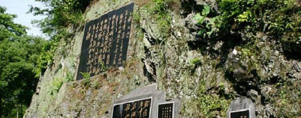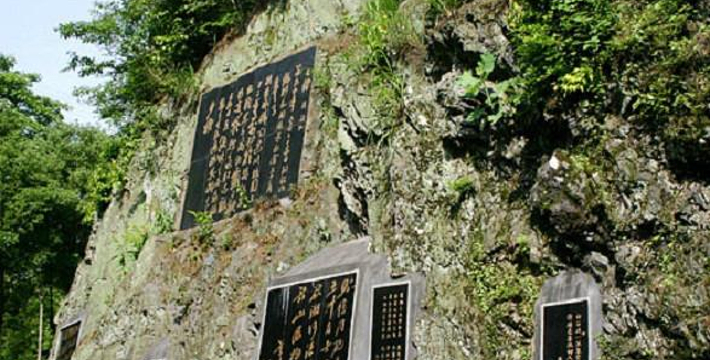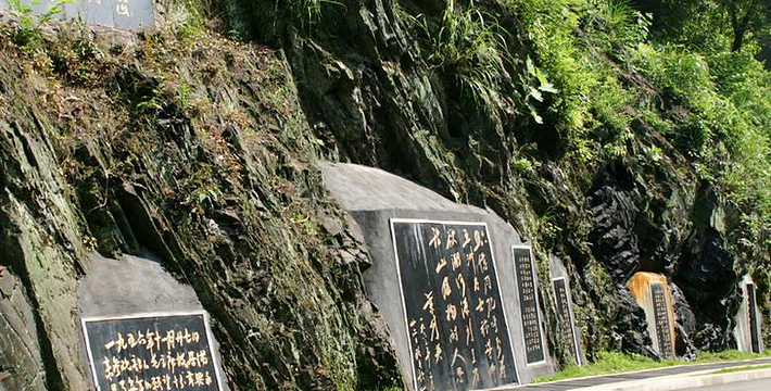 进入门楼,游道边的黑色山体上,嵌着一块块名人留言的青石碑。漫步滴水洞游道,仿如置身诗情画意中,松与竹,青葱得痒人心肺,山花、野鸟、人面、歌声,使人陶醉。