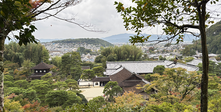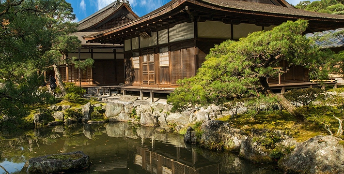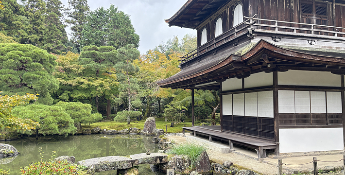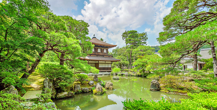 尽管事实上它并不是银制的。它是1492年为幕府将军义政建的休闲别墅。但由于连年内战,日本太穷,实在没有足够的资金完成原建设计划,也就是说把整个建筑用银覆盖,事实上它是用黑色木头建造的,房顶上栖息着一只凤凰。 前面是庭园,再从瀑布和水潭间的小路爬上满是树木的山坡。像他社父幕府将军金阁寺的创建者足利义满一样,义政也是一位艺术的赞助者。在寺内庭园中还有著名的同仁斋。要想参观,需出具书面申请。