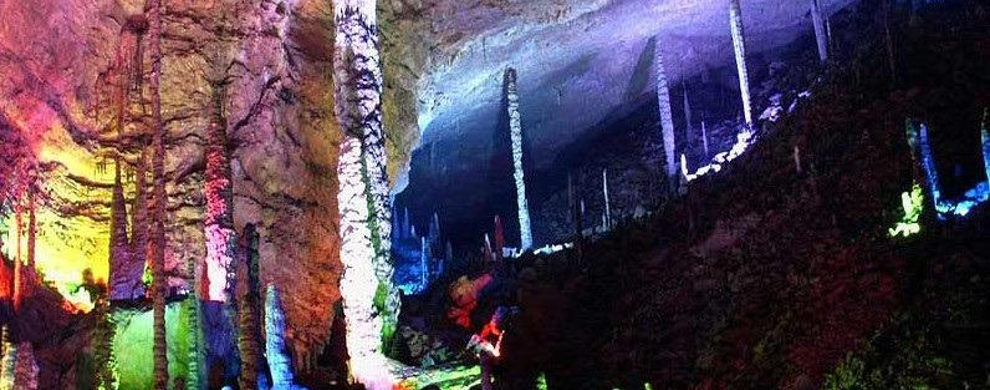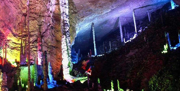 黄龙洞保持了五亿年前原有的古老石纹和地质地貌,钟乳奇石蜿蜒攀附如巨龙腾飞,洞内的侏罗纪恐龙公园,使人恍如置身于神秘的远古时代。