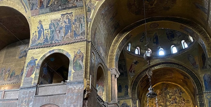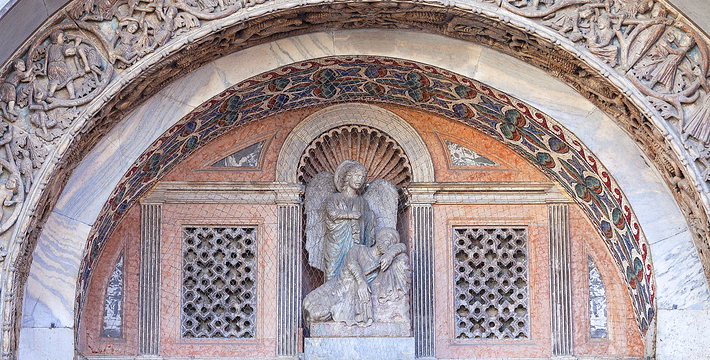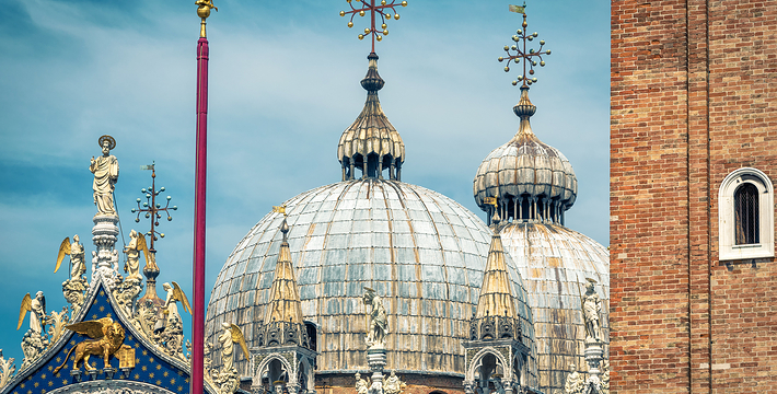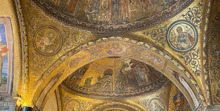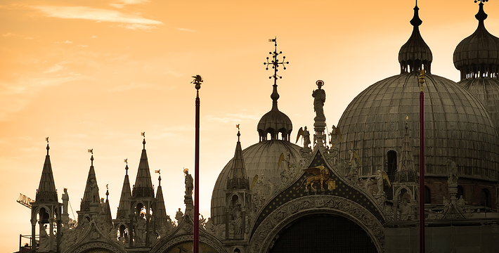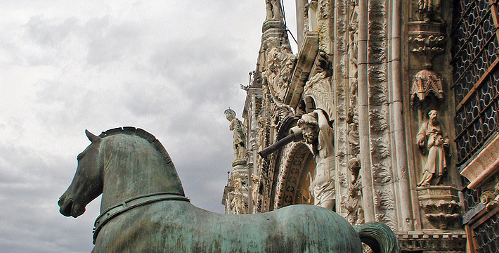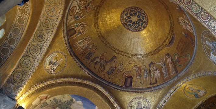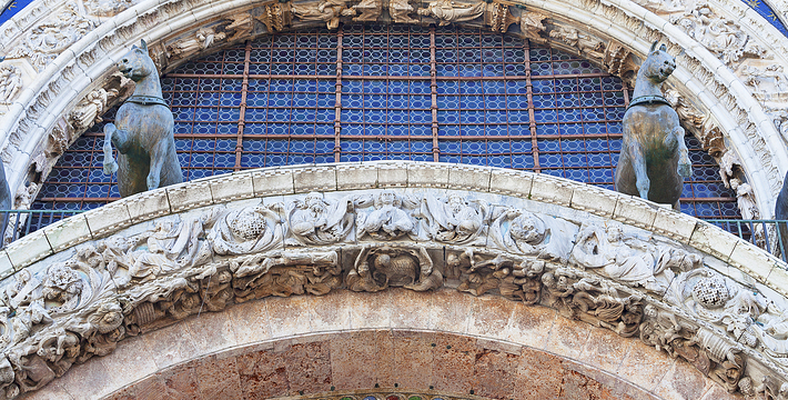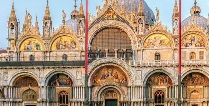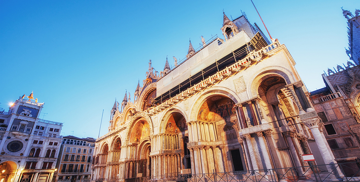 圣马可大教堂几乎有1000年的历史了。拥有500多根石柱和4000多平方米的马赛克画。一方面它集合了拜占庭、哥特的风格,另一方面也具有东方风格,向东方文化开放,这就是该圣殿的魅力所在。为纪念耶酥十二圣徒和收藏战利品而建,始建于公元9世纪,完工于1094年。其后遭遇大火,历经修复成现今的规模。教堂的精华是位于中央祭坛后面的Psaa'oro,始建于公元976年,其后多次修补、镶嵌宝石等,非常漂亮。位于教堂右侧的珍宝馆收藏、陈列有1204年十字军东征从君士坦丁堡带回来的战利品。 教堂右侧洗礼堂的镶嵌画也非常美丽。