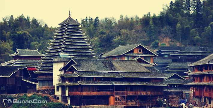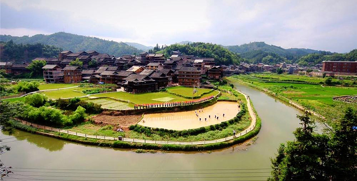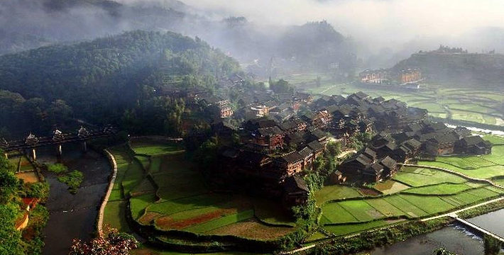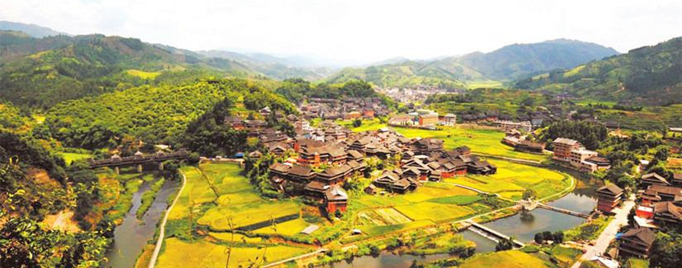 吊脚木楼、鼓楼、风雨桥与周边大山、小河、田野构成别致而独特的美景