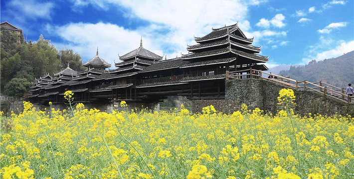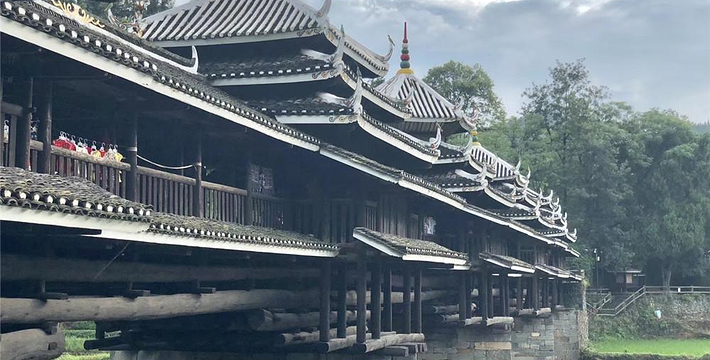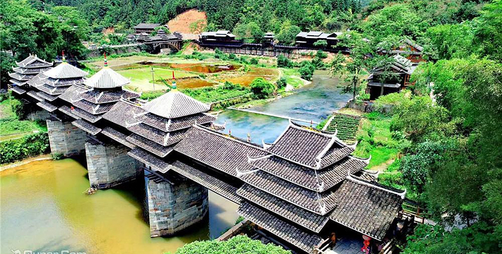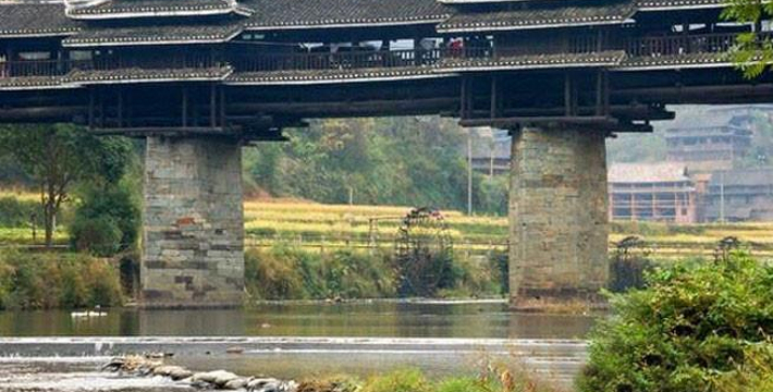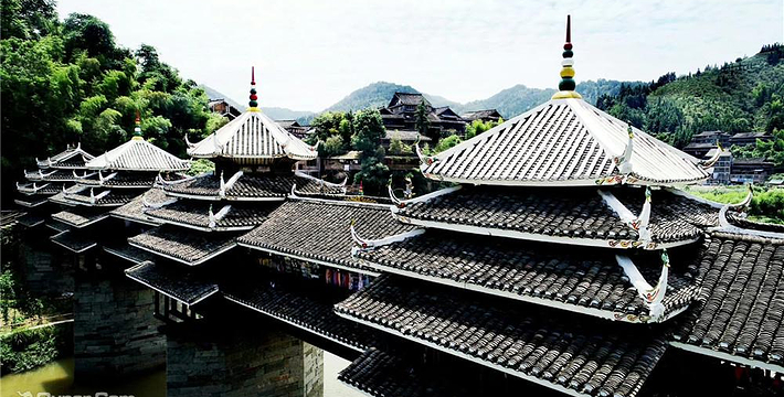 又名永济桥,1924年建成。桥梁横跨林溪河之上,亭廊相连、浑然一体,雄伟壮观。是侗族风雨桥的典型代表。