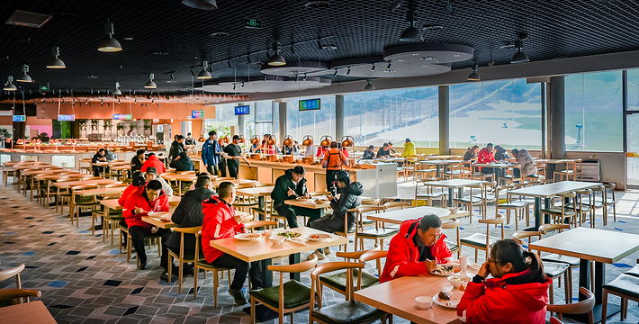 咖啡厅内设有一个观景长廊,当你走到这里,迎面是苍茫的雪山,有的从雪道飞驰而下,有的在雪地里戏雪耍闹,整个滑雪场尽收眼底。