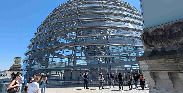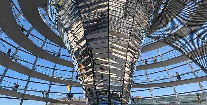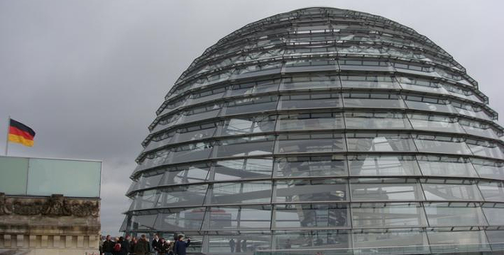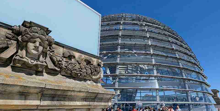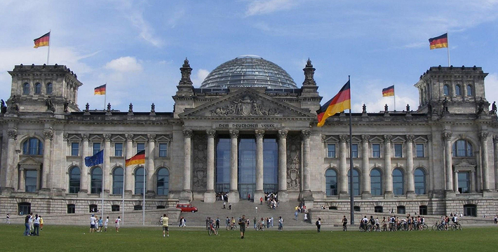 柏林的德国国会大厦建于1884年,由德国建筑师保罗·瓦洛特设计,采用古典主义风格。1918年11月9日,议员菲利普·沙伊德曼通过国会大厦的窗口宣告共和国的成立。1933年2月27日大厦失火,部分建筑被毁,失火原因不明。“国会纵火案”成为纳粹统治者迫害政界反对派人士的借口.二次大战中,大厦遭到严重毁坏。1945年4月30日,苏联红军把红旗插上国会大厦的屋顶,宣布了反法西斯战争的胜利。1961至1971年间,大厦按保罗·鲍姆加藤的设计方案重建。重建的国会大厦对建筑进行了简化,省去了1945年被炸掉的大厦圆顶部分。这座曾位于柏林墙边界上的大厦内曾办有“德国历史问答”展览。目前,该展览迁至德国大教堂中。东西德合并之后,德国联邦议会决定重新迁入国会大厦。1990年10月3日德国人民在国会大厦前庆祝了国家的重新统一,同年12月20日,国会大厦则被定为德国联邦议院所在地。1994年至1999年,诺曼·,对国会大厦进行了重新修建,建成为一座现代化的议会办公大楼,新建的穹形圆顶供人游览。1994年修复工程开始之前:Christo 和Jeanne Claude 包裹国会大厦。德国联邦议院于1998年底迁入国会大厦,1999年在此选举下一任联邦总统。现在,曾让人争议一时的穹形圆顶已成为柏林城的新标志。