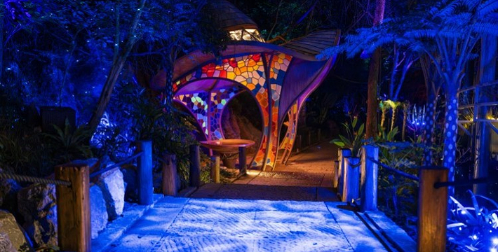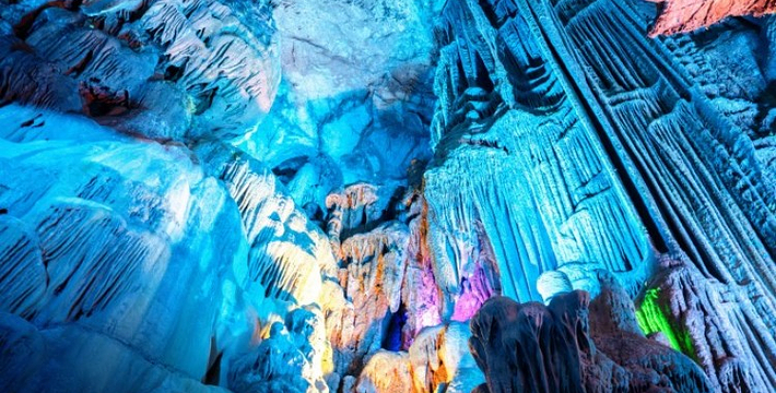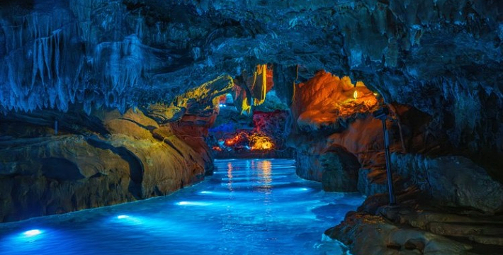 洞内钟乳石低垂,游人时而低头,时而仰首,任它摆布。河道弯弯曲曲、宽宽窄窄。窄处容一船通过,宽处黑 咕隆洞,似乎看不着边际。地下河水清澈透底,两岸景石在彩色灯光照射下熠熠生辉。此情此景,不禁令人生疑莫非身在仙境。