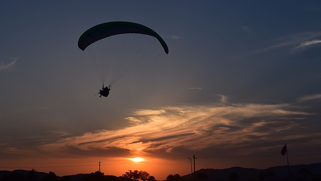 7、滑翔伞起伞(起飞)时,请您务必全力配合教练,身体微微前倾,协同用力,控制身体重心用力向教练指示方向奔跑,直至飞出山体为止。
