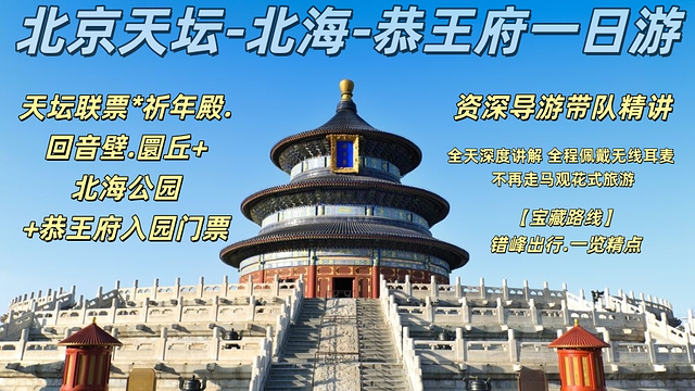【费用包含】套餐1:【9:00集合/9:30发团】天坛+北海+什刹海+恭王府线路:含路线景区门票(天坛联票*含祈年殿.圜丘.回音壁+北海门票+恭王府门票)。