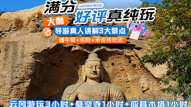 4、【成人全票】:费用包含往返车费+导游讲解+中午简餐+成人云冈门票+成人悬空寺入园门票+成人悬空寺登临门票+成人木塔门票。适合年龄在19-59周岁的旅客使用。悬空寺登临门票需要导游现场团队窗口统一办理,若当天景区无登临门票,旅行社退登临门票费;
