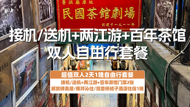 2.套餐包含:重庆观音桥桔子酒店/解放碑美居酒店/南坪沁住酒店1晚+百年茶馆门票2张+两江夜景游船船票2张+单接|送机+2人早餐+赠送保险