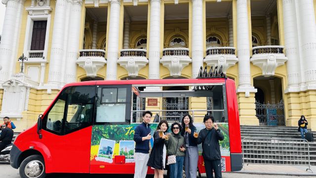 在整个旅程中享受喝啤酒的乐趣——只有我们才能提供的独特体验 探索河内市丰富的历史旅游景点 乘坐典型的迷你巴士,欣赏繁华街道的不同景色,享受新体验