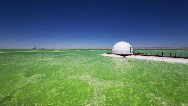 盐湖如翡翠般斑斓的色彩和“盐花”这一独特的地质结晶形态,细节精美,充满自然奇趣。
