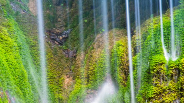 是景区另一特色,汇聚成五彩莲池、水帘仙宫及水帘仙宫瀑布、玉如意瀑布、鹿回头瀑布、震天雷瀑布等壮美景观
