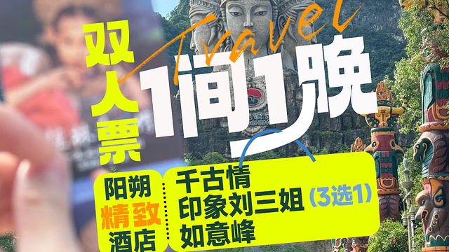 【费用包含】此套餐适用于2成人,所选房型1天1晚,阳朔精品酒店多选1住宿1间1晚+双人印象刘三姐演出票/双人桂林千古情演出票/如意峰索道(3选1)。