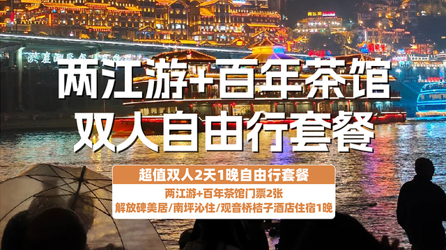 2.套餐包含:重庆观音桥桔子酒店/解放碑美居酒店/南坪沁住酒店1晚+百年茶馆门票2张+两江夜景游船船票2张+2人早餐+赠送保险