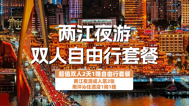 2.套餐包含:重庆观音桥桔子酒店/解放碑美居酒店/南坪沁住酒店1晚+两江游夜游船票2张+2人早餐+赠送保险