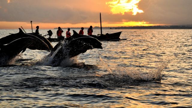 罗威纳:神奇的日出海豚观赏和浮潜体验【标志性景象:在壮丽的金色日出背景下,亲眼目睹数百只野生海豚在巴厘岛北部海域跃出水面。 沉浸式体验:有机会(视情况而定)在海豚的自然栖息地附近游泳。 水下美景:探索罗威纳浮潜点充满活力的海洋生物,欣赏健康的珊瑚和色彩斑斓的鱼群。】