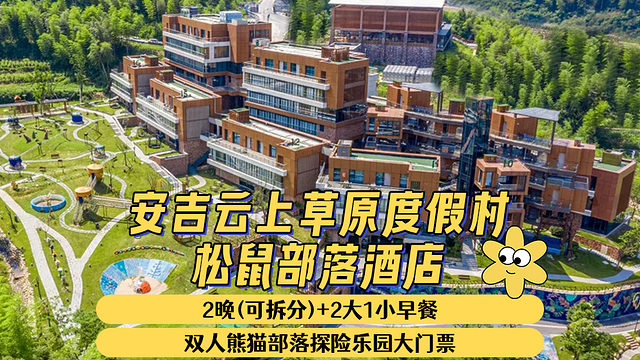【景酒套餐3天2晚】云上草原松鼠部落酒店2晚+2大1小早餐+双人熊猫部落门票+书咖下午茶1份