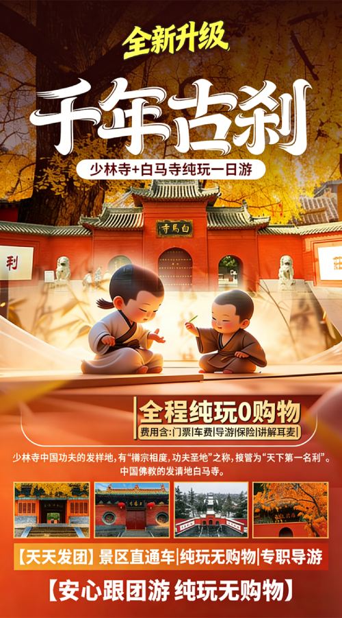洛阳出发 少林寺+白马寺一日游【含导游讲解+市区酒店接团】【[酒店上门接团]洛阳市区中心酒店可提前上门接团(法定节假日期间需自行前往集合点上车)】