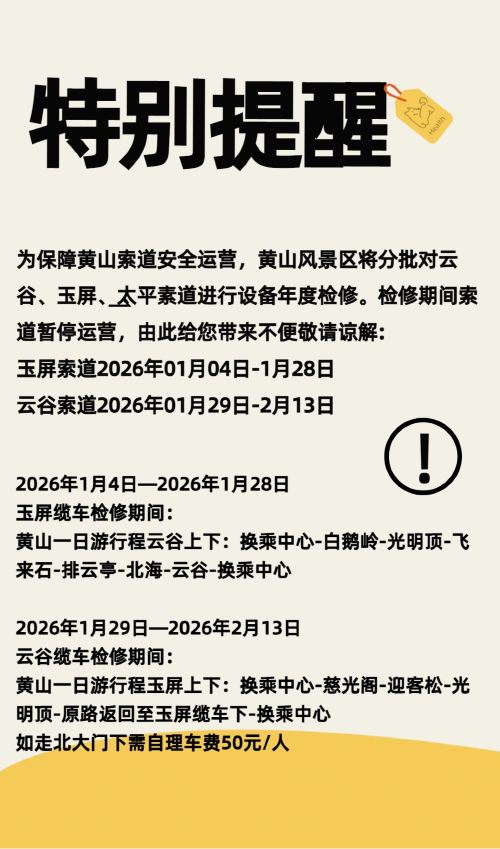 ▲ 温馨提示:黄山风景区分为前山景区(慈光阁方向)和后山景区(云谷寺方向),导游会根据当天的天气、客流等情况,选择上山线路,游览线路可能会与此线路相反,以确保行程顺利进行,望请谅解!