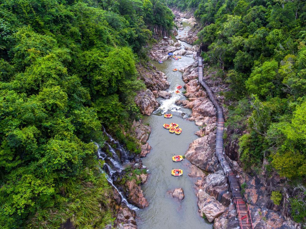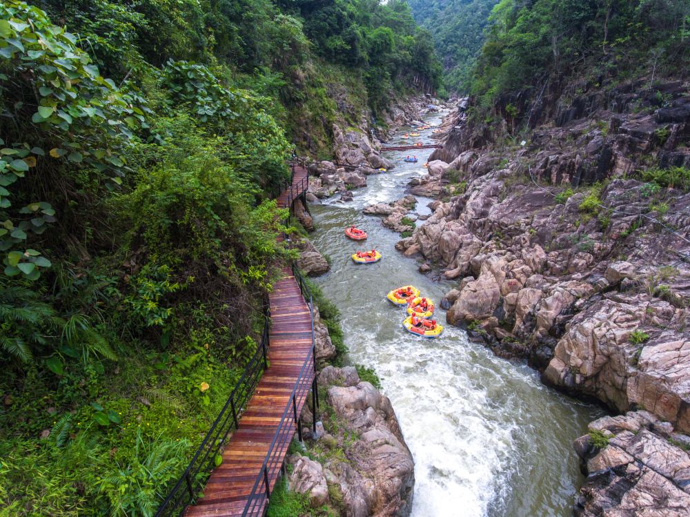 红峡谷漂流项目共计有26道关卡,峡谷岩壁险峻奇特,河流多岩滩激流,沿岸是茂密的原始热带雨林,蜿蜒漂流时,常有山泉瀑布自上而落,这趟刺激的项目全程3.8公里,青山峡谷间,一抬头便可领略到大自然鬼斧神雕,低头可见浪涛激流,落差很大,自高处滑降,心胆提着,刺激非凡!