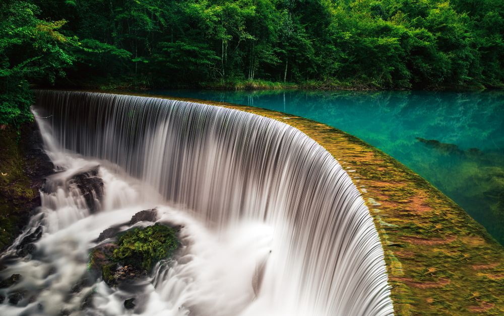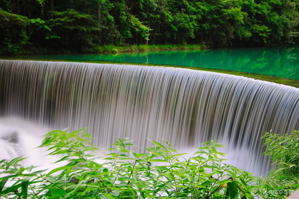 ▲ 潭水蓝绿如宝石,弧形瀑布如月牙悬挂,是拍照圣地。