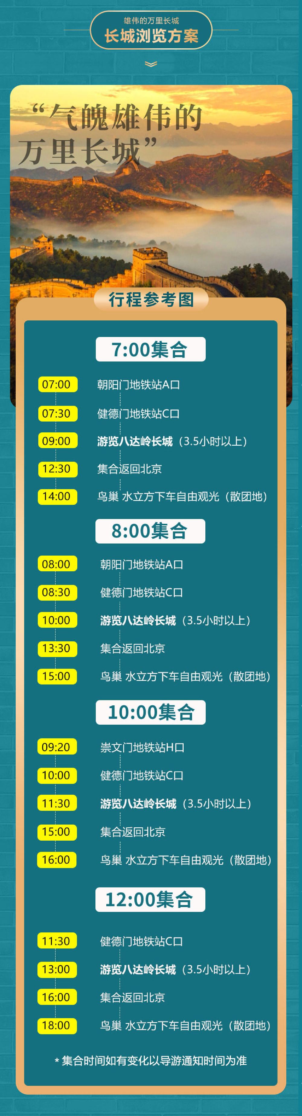 2.大巴车早7:00,早8:00,早10:00,中午12:00车次。因为是团体出行,请提前在地铁口处集合等候,过时自行前往景点,请相互理解,不要影响大家的出行