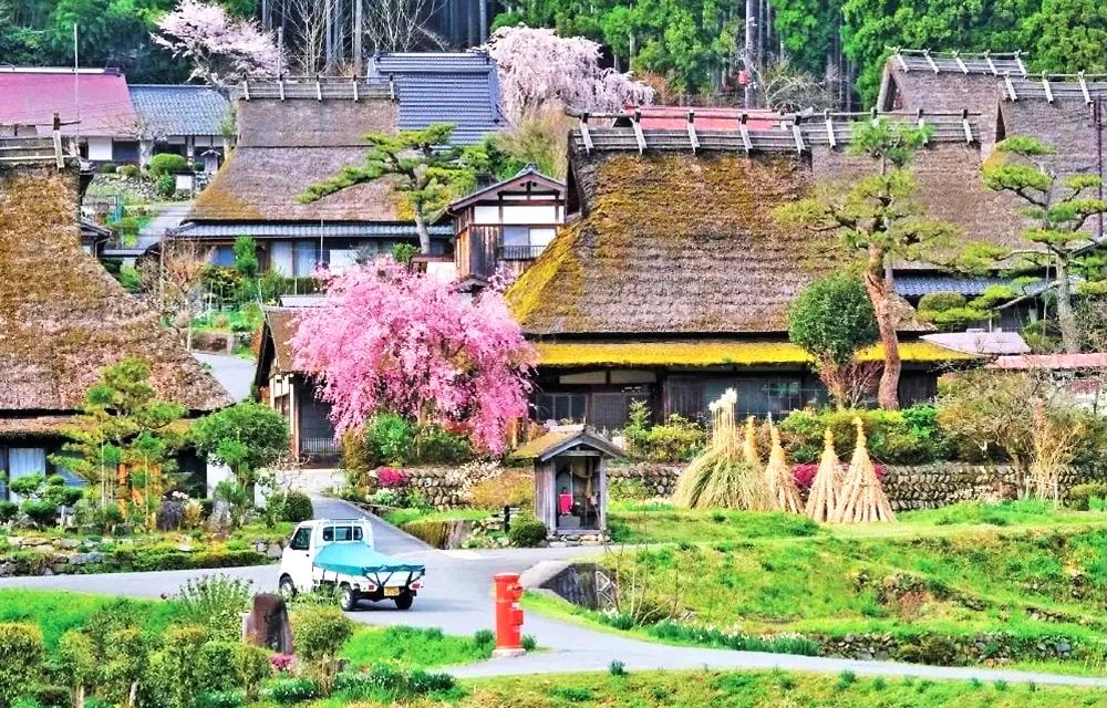 ▲ 美山茅草屋之里 保存了约 39栋 茅草屋顶古民家,多建于江户至明治时代(约有150-230年历史),被指定为日本 “重要传统建造物群保存地区”这里的房屋采用独特的 “北山型” 结构。屋顶上半部分为“切妻造”(人字形),下半部分为“寄栋造”(四坡顶),并用名为 “千木” 的交叉木条加固,以应对冬季积雪。 美山合掌村四季皆有不同的风貌:春季:樱花与古朴的茅草屋相映。夏季:被青山绿水环抱,一片翠绿。 秋季:红枫叶将村落染上温暖的色调。冬季:白雪覆盖村落,期间举办 “雪灯廊”活动。