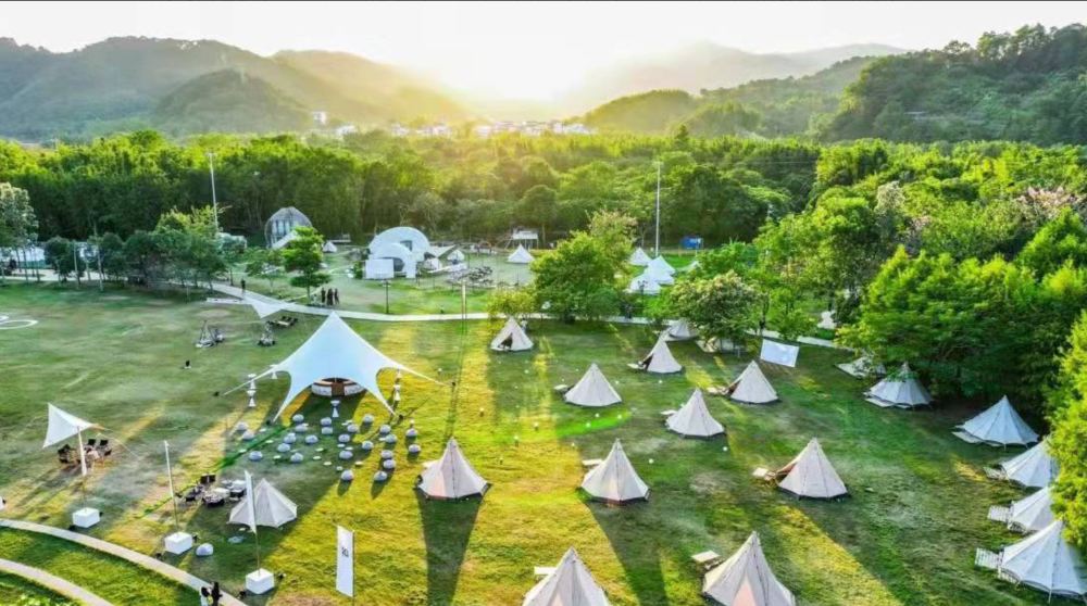 ▲ 流溪温泉广场露营场地,设有拓展及游乐活动场,包括美术馆、研学区、手工制作区等,还有蒙古包帐篷、金字塔印第安帐篷等多种轻奢帐篷可供选择。营地还配备休闲露营清吧、户外电影、KTV 等设施,满足游客的娱乐需求。