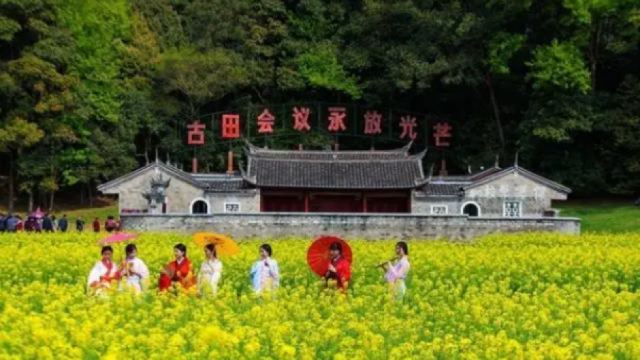 ▲ 走进福建龙岩上杭县的古田会议会址,这座由廖氏宗祠改建的革命圣地,青瓦红墙间仍保留着1929年会议原貌47。"古田会议永放光芒"八个大字下,斑驳的木桌椅、马克思画像和煤油灯,无声讲述着伟人确立"思想建党、政治建军"原则的历史瞬间48。春日里,油菜花海与百年香樟环绕会址,红军广场的伟人雕像巍然矗立,与盛放的木棉花共绘红绿交织的壮美画卷6。免费参观的纪念馆内,草鞋、枪支等文物带您穿越烽火岁月,周边还可体验采茶、垂钓等田园乐趣