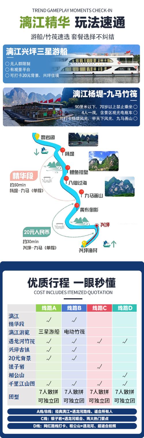 桂林出发+漓江四星游船(杨堤-草坪)+兴坪古镇+20元背景+十里画廊、月亮山+遇龙河竹筏(请根据套餐选择)+千里江山图