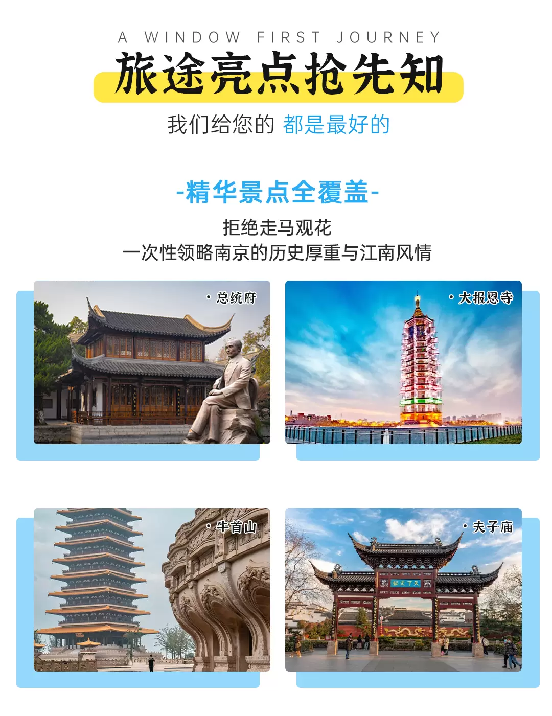 南京总统府+牛首山文化旅游区+侵华日军南京大屠杀遇难同胞纪念馆+大报恩寺遗址景区+夫子庙一日游