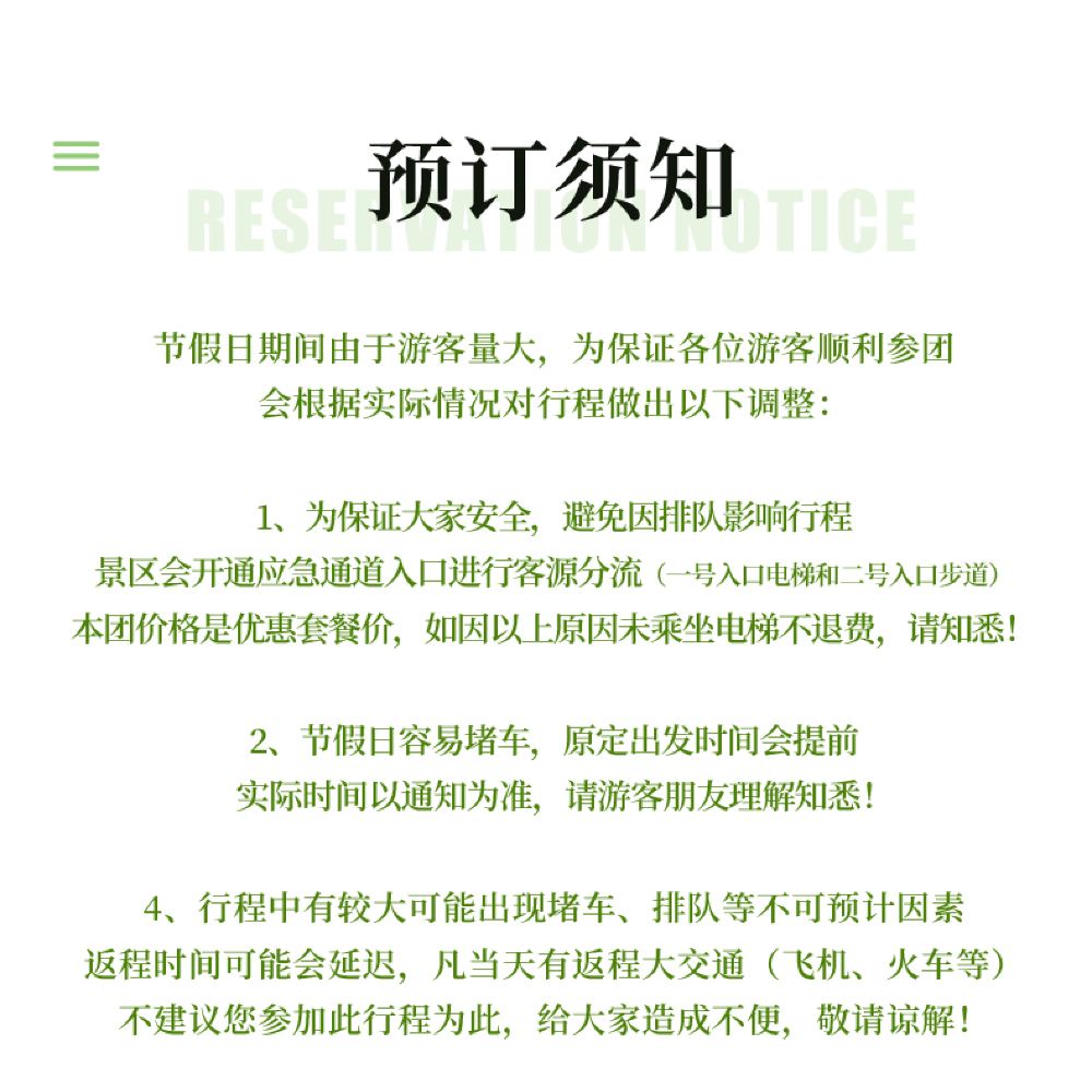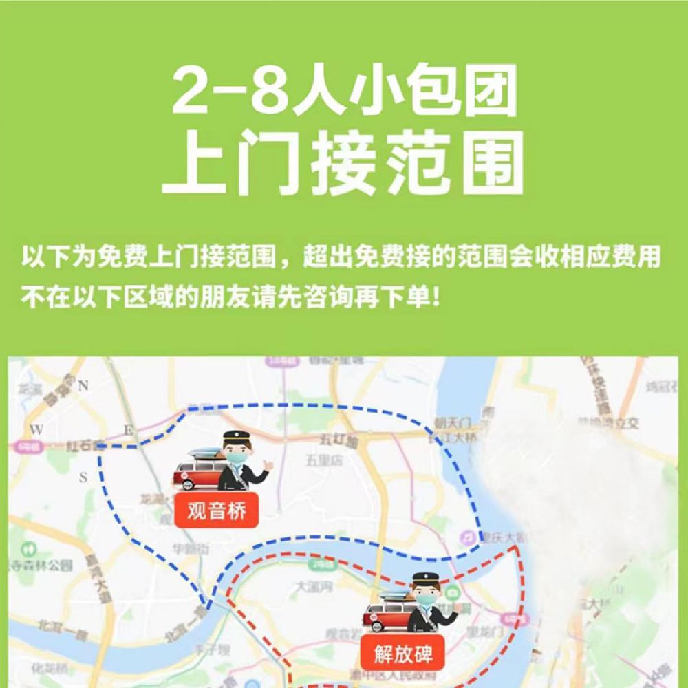 早上7-8点解放碑,南坪,观音桥商圈可上门接驳,如一人出行,只能在解放碑商圈接驳,请知悉,如遇节假日,接驳时间会提前,具体接驳时间以出发前一天导游通知为准,