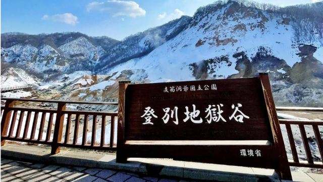 ▲ 【登别地狱谷】 登别地狱谷是位日本北海道登别市的一个火山口遗迹,邻近洞爷湖。火山爆发后,由融岩所形成的一个奇形诡异的谷地;灰白和褐色的岩层加上许多地热自地底喷出,形成特殊的火山地形景观。