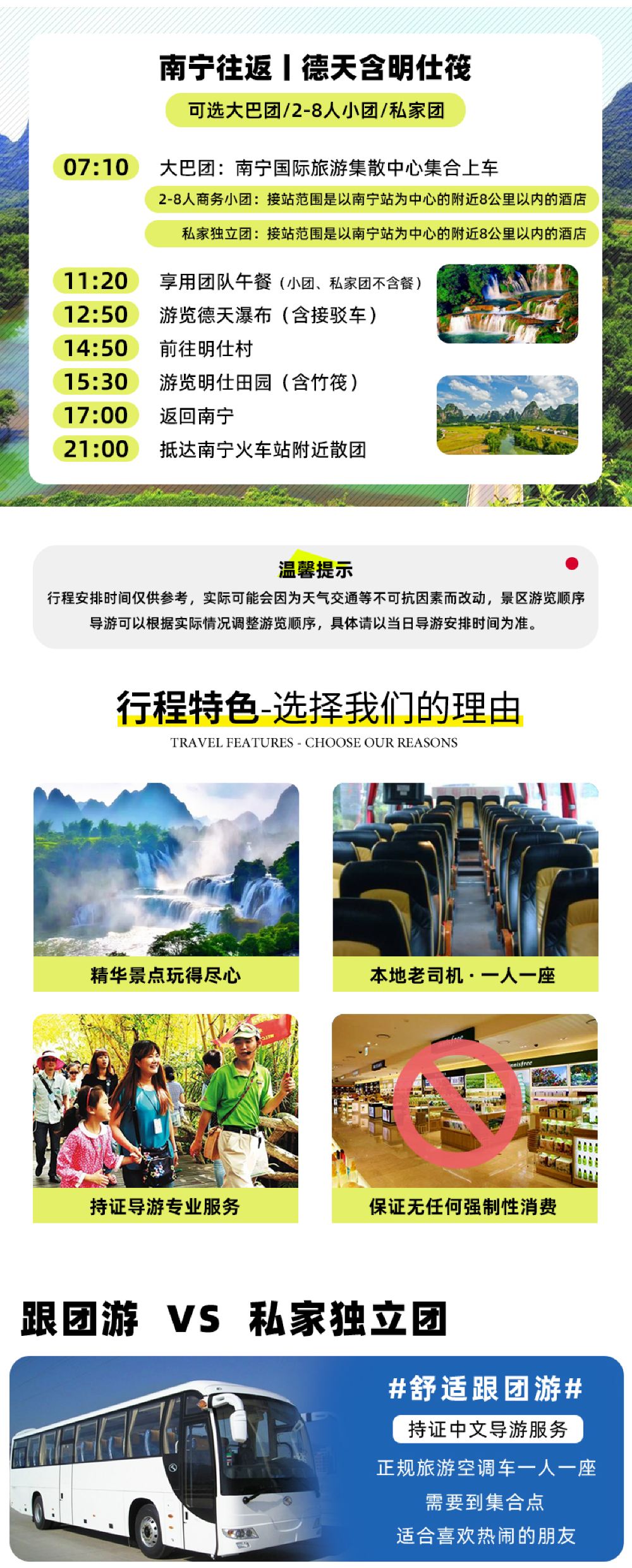 1、【私家独立团】套餐提供上门接送服务:南宁市区范围:东至琅东车站,西至西乡塘车站,南至江南车站,北至安吉车站。如超出指定区域不提供上门接服务,如超范围请按司机实际通知安排就近的集合地点候车,部分酒店不能直接到门口接上车地点以司机通知为准。