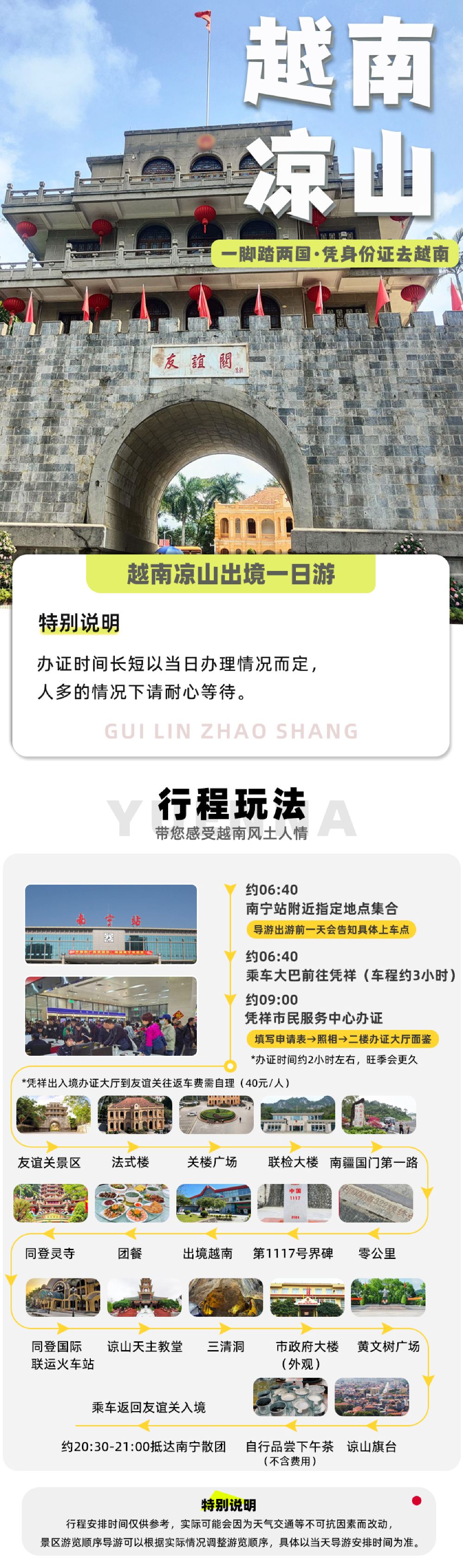 【车费说明】指定时间于凭祥办证中心集合,办理面见,办证结束后需自行前往友谊关,凭祥-友谊关车费不含,需自驾或者打车到友谊关等候和导游会合,路程约18公里(车费往返约40元/人),具体行程导游会提前一天联系您,如有疑问请联系客服!