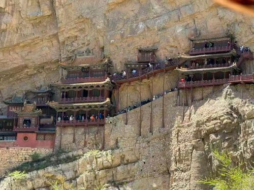 ▲ 悬空寺4A级旅游景区,世界岌岌可危十大建筑,位于恒山金龙峡西侧翠屏峰峭壁间,原叫“玄空阁”“玄”取自于中国道教教理“空”则来源于佛教的教理,后改名为“悬空寺”,是因为整座寺院就像悬挂在悬崖上,在汉语中,“悬”与“玄”同音,因此得名。 悬空寺始建于北魏后期(公元491年),距今已有1500多年,是佛、道、儒三教合一的独特寺庙。“悬空寺”建筑极具特色,以如临深渊的险峻而著称,素有“悬空寺,半天高,三根马尾空中吊”的俚语,以如临深渊的险峻而著称。 悬空寺是全国重点文物保护单位,恒山十八胜景。