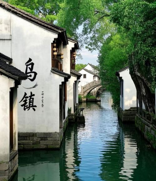 ▲ 白墙黛瓦的民居依河而建,墙上 “乌镇” 题字醒目,石桥跨于河道之上,尽显水乡雅致