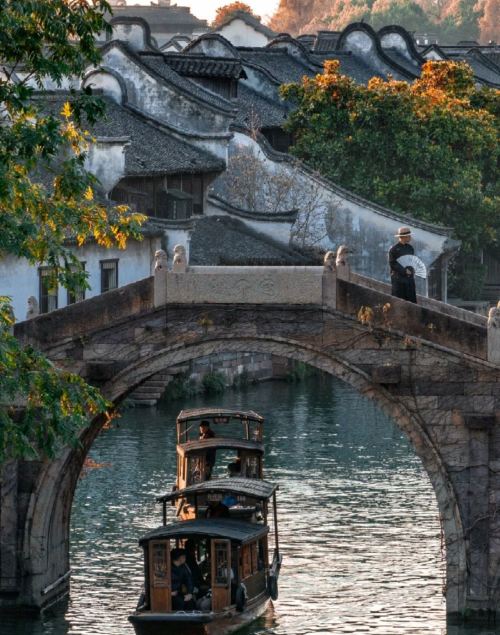 ▲ 行人往来,乌篷船从桥下驶过,碧水映着暖光,是江南典型的温婉画面