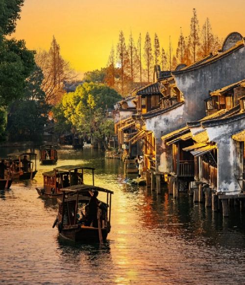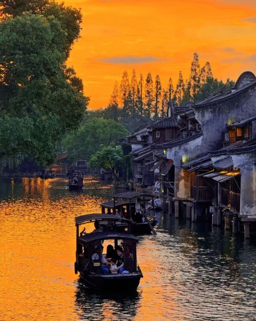 ▲ 落日时分,河道被余晖染成金橙,乌篷船摇曳,两岸古宅浸在暖光里,尽显水乡的黄昏温柔