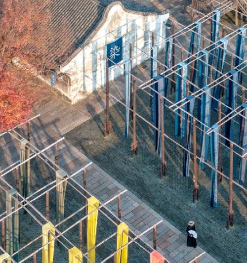 ▲ 乌镇染坊,蓝黄布料挂于木架间,秋树红叶点缀,是传统非遗的鲜活场景