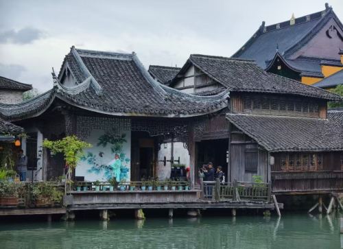▲ 乌镇临水戏台,古建飞檐翘角,台侧绘着戏曲人物,游客驻足观赏,水乡韵味与民俗文化相融