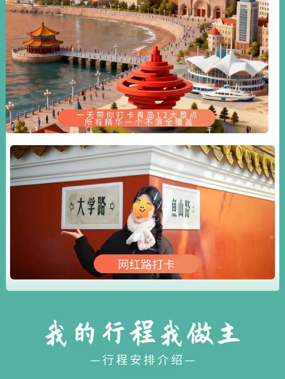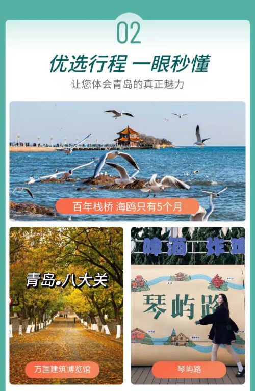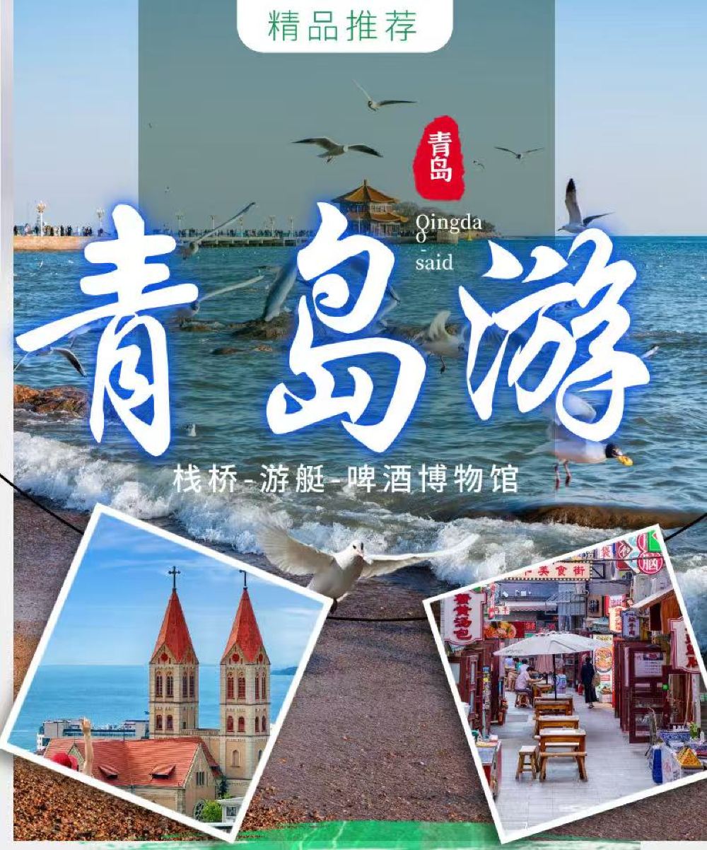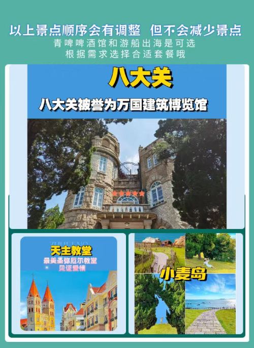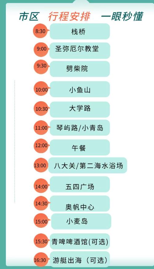 游艇+栈桥+圣弥厄尔教堂+劈柴院+小鱼山+大学路+琴屿路+八大关+第二海水浴场+五四广场+奥帆中心+小麦岛公园+青啤博物馆