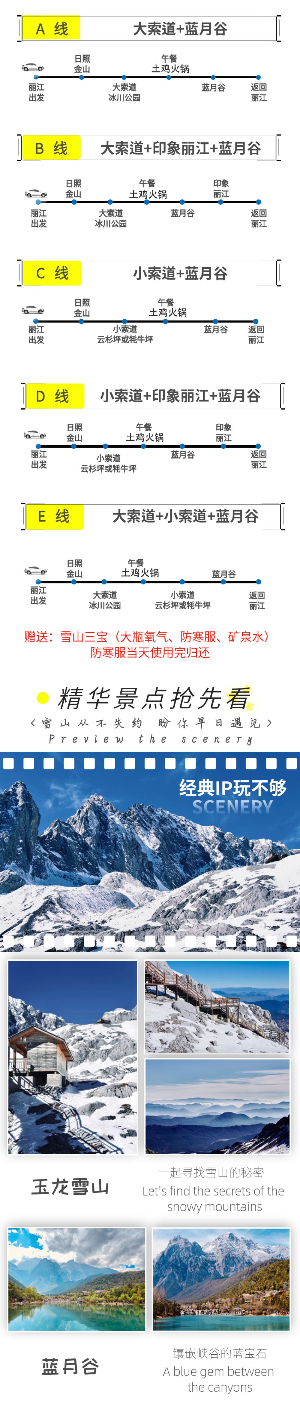 ▲ 大索道和云杉坪小索道的区别:大索道上玉龙雪山4506的海拔可到观景台4680米,云杉坪小索道到达3356的云杉坪高原草甸,可以远观雪山。