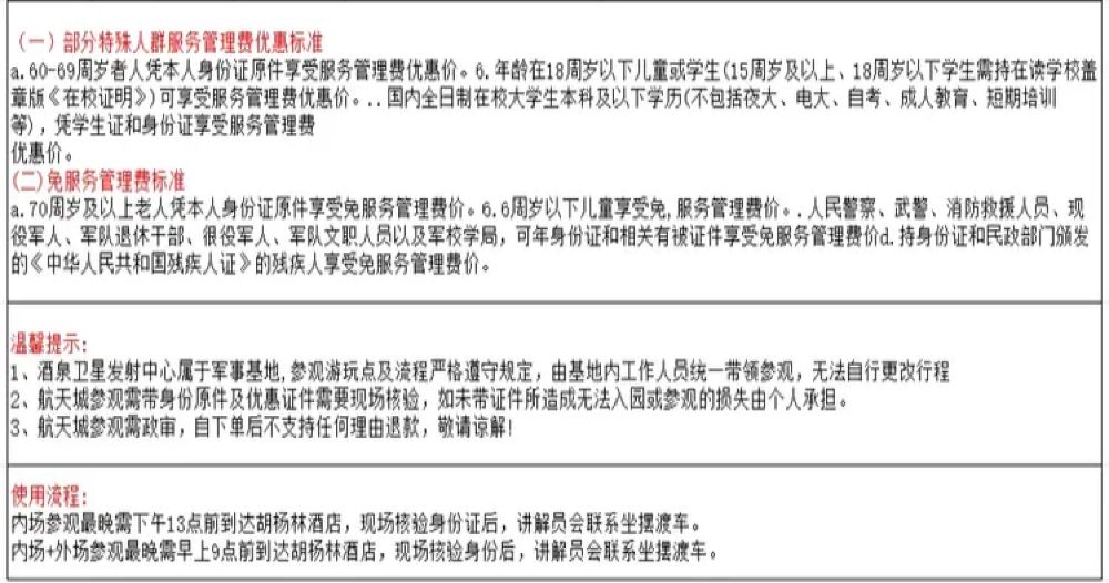 1.因项目特殊,目前仅接受中华人民共和国持居民身份证客户参加,参团客人需在出发前3-5个工作日向我方提供姓名、身份证号等相关信息进行政审,如因个人原因不提交政审信息导致无法进入航天城,费用不予退还,敬请谅解;