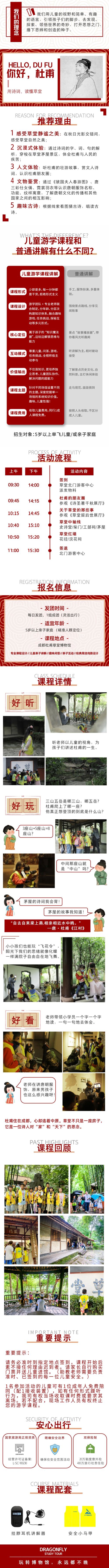 3.此产品需自行前往杜甫草堂集合,请准时参加。讲解会准时开始,迟到的客人请自行入馆与团队汇合。迟到造成的讲解缺失无法补充缺失的讲解内容,所付讲解费无法退还;