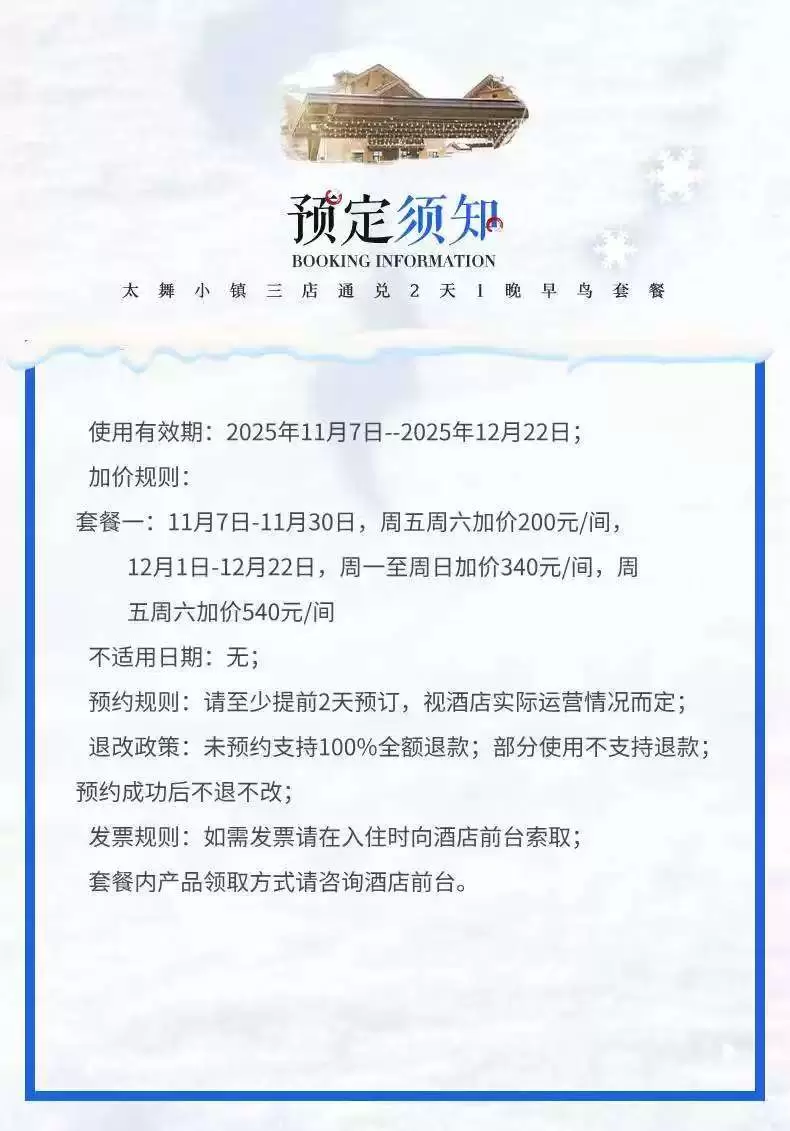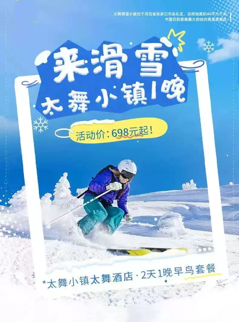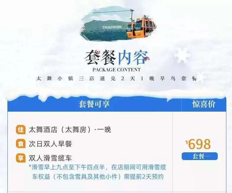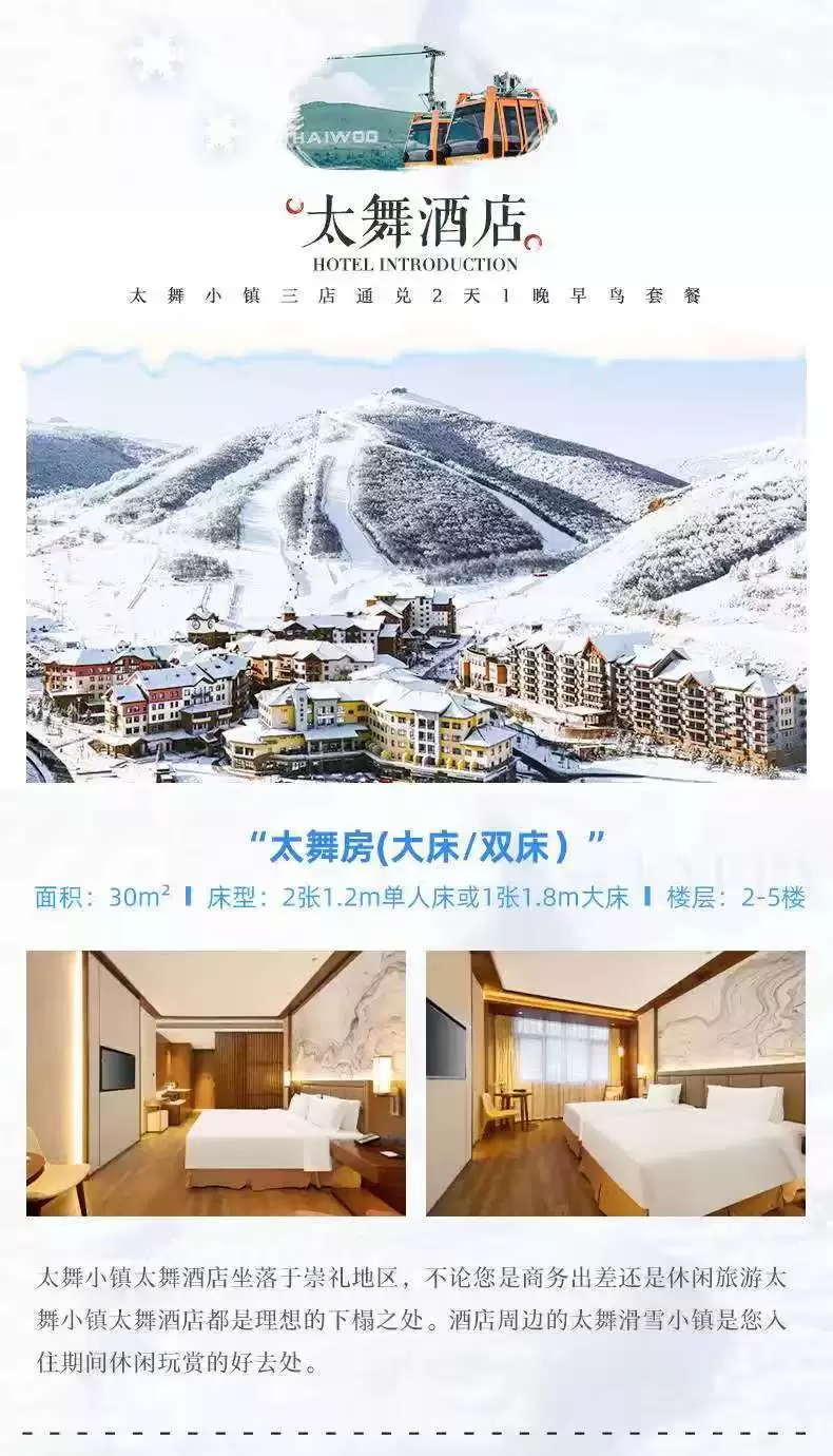 太舞小镇太舞酒店1晚+太舞滑雪场2人1天雪票(不含雪具)+2人温泉+高铁接驳车+园内摆渡车+免费停车