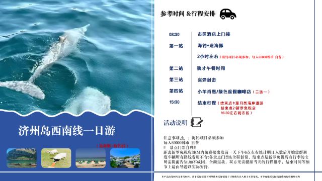 【济州岛海豚之旅】西南线海钓&海豚船+狭才+小羊肖恩一日游