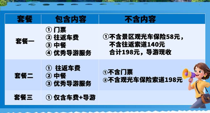 温馨提示:免票人群请选择免票套餐或者优待人群选项,若免票人群选择含票套餐我社按照打包价格导游现退30元/人。