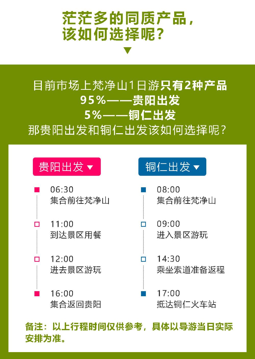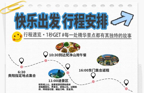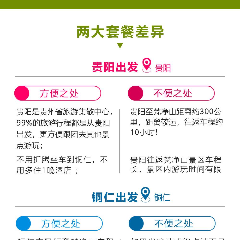 旅游旺季:存在景区超级人多需排队的现象哦!也有可能存在堵车等情况回到贵阳可能在晚上23-24左右都有可能哦 也有可能存在因为人多爬不上红云金顶的情况,也有可能存在我社工作人员为大家抢散客票出现时间段不一致的客人,我社会尽量合理的安排大家的游玩时间哦!!!
